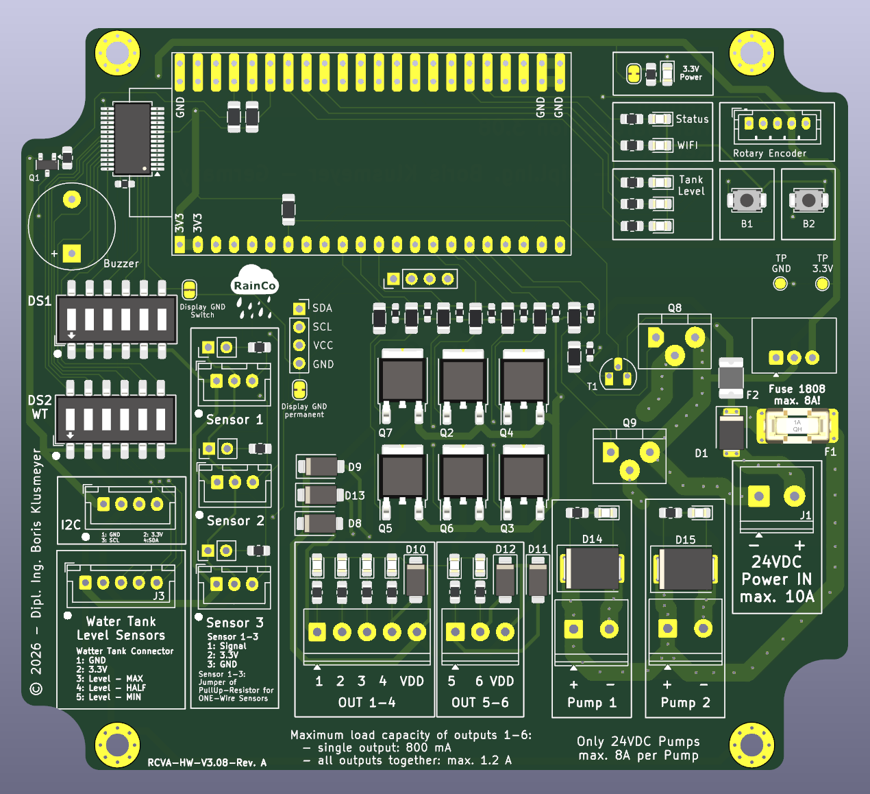 - Connection for water tank monitoring (3 sensors: min, half, max)
