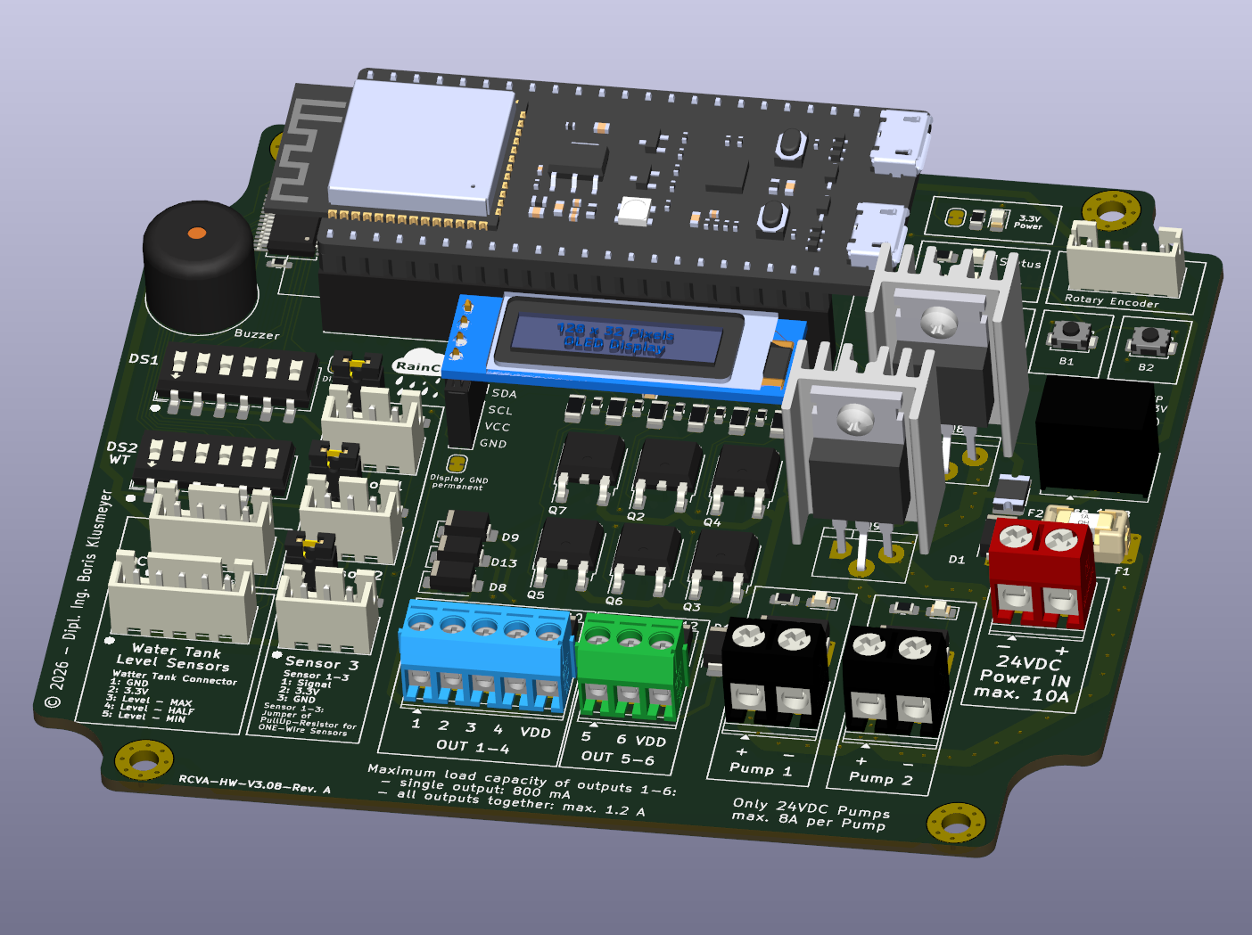 - Connection for water tank monitoring (3 sensors: min, half, max)