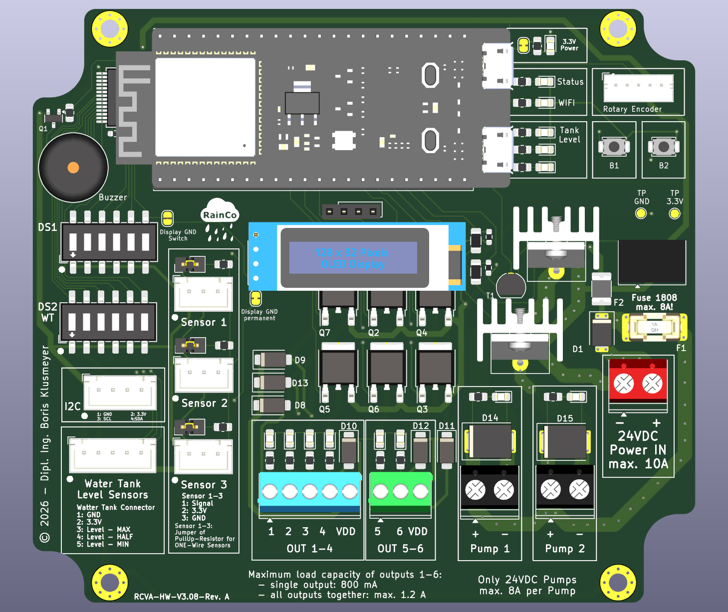 - Connection for water tank monitoring (3 sensors: min, half, max)